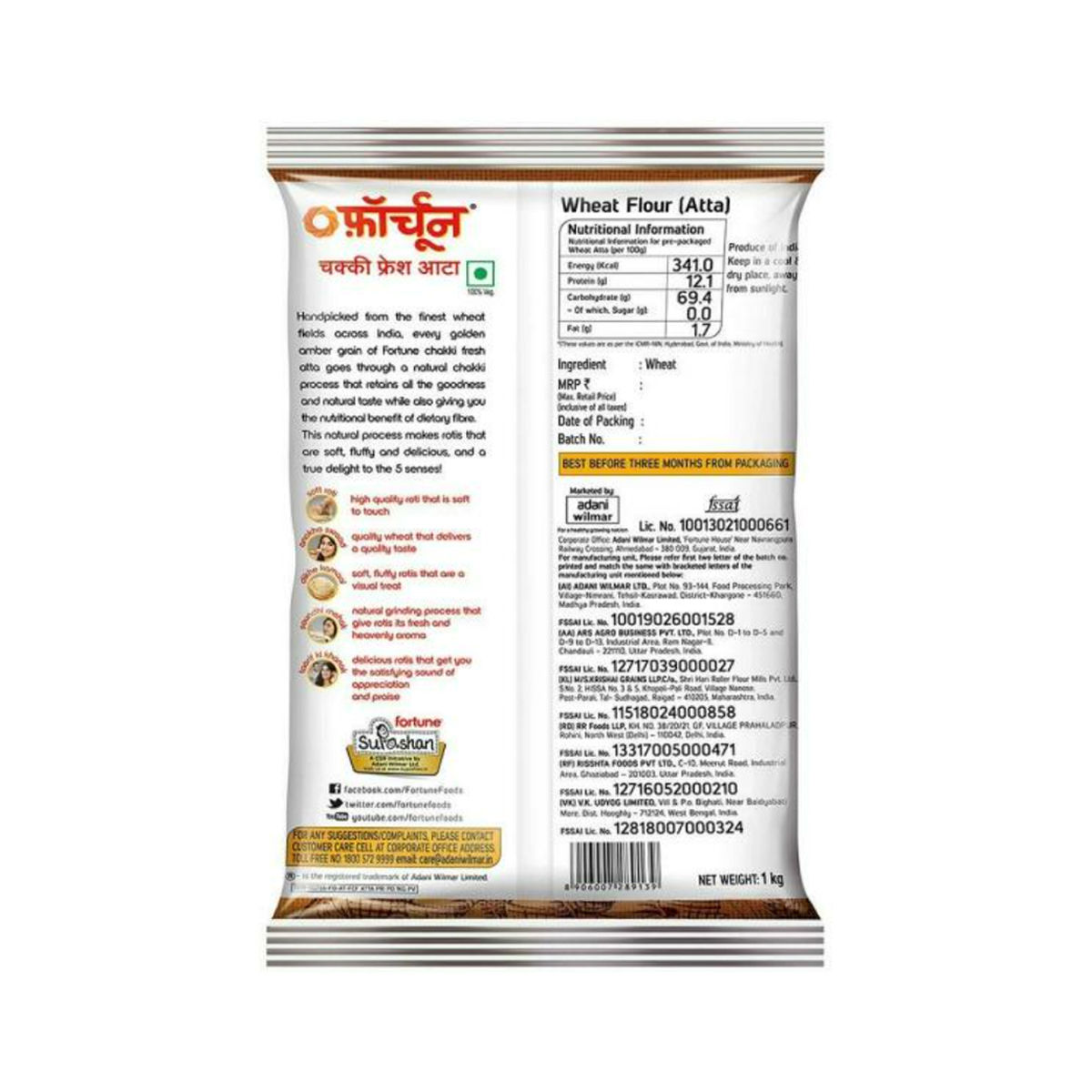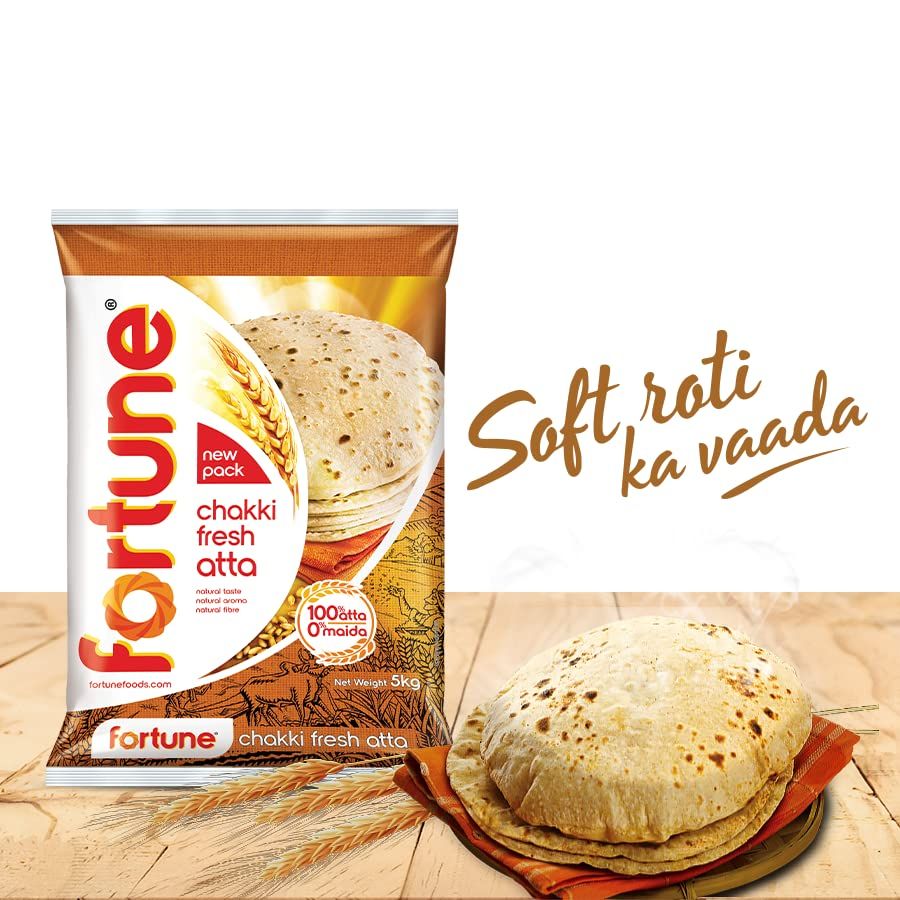 “Fortune Chakki Fresh Atta – Made from 100% whole wheat, this atta delivers soft, fluffy rotis with a rich aroma and authentic taste.”